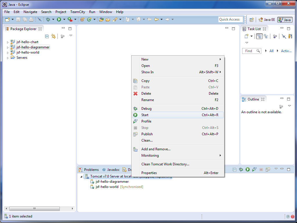 1. In the Servers tab, right-click Tomcat v7.0 Server at localhost and select Start.