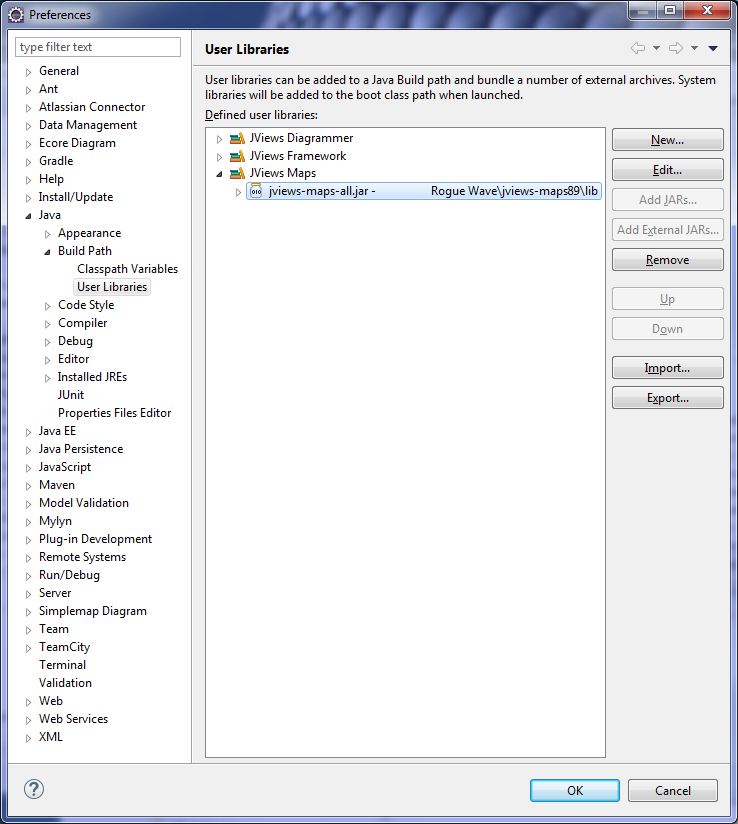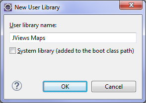 4. Click New and enter a user library name of your choice, for example, JViews Maps and then click OK.