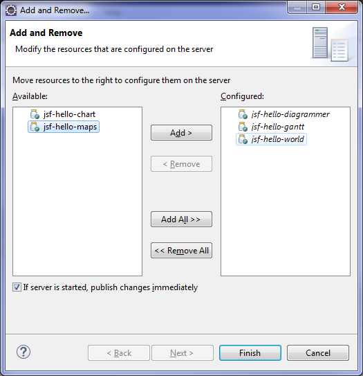 2. You can see the jsf-hello-world and jsf-hello-diagrammer applications you previously created in the right pane. Select jsf-hello-maps in the left pane and click Add >: