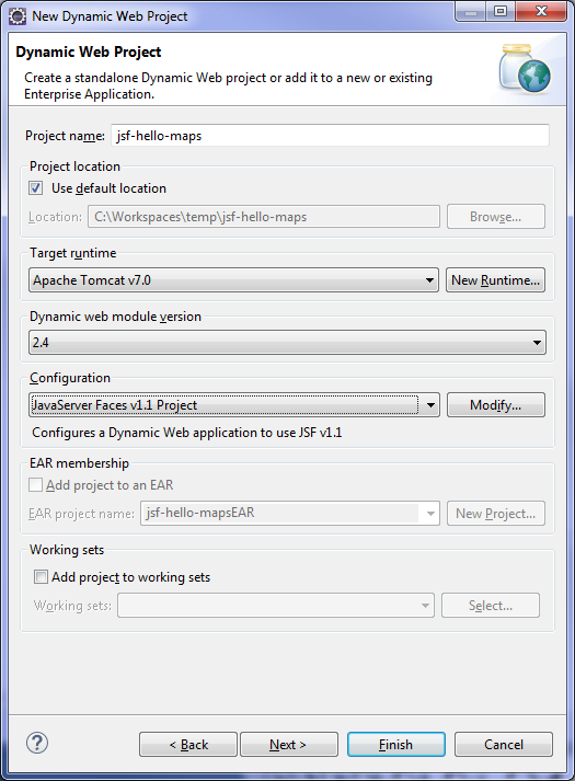 2. Enter jsf-hello-maps as the Project name and select JavaServer Faces v1.1 Project as the Configuration.
