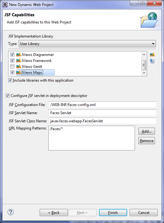 To create a customized user library for the jars required when developing JViews Maps JSF applications: