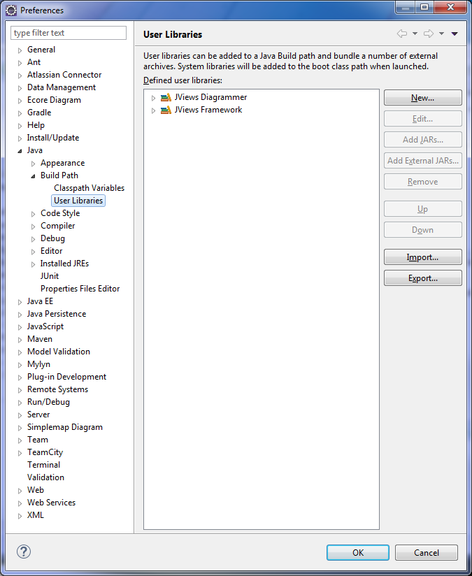2. Click Windows>Preference>Java>Build Path>User Libraries.
