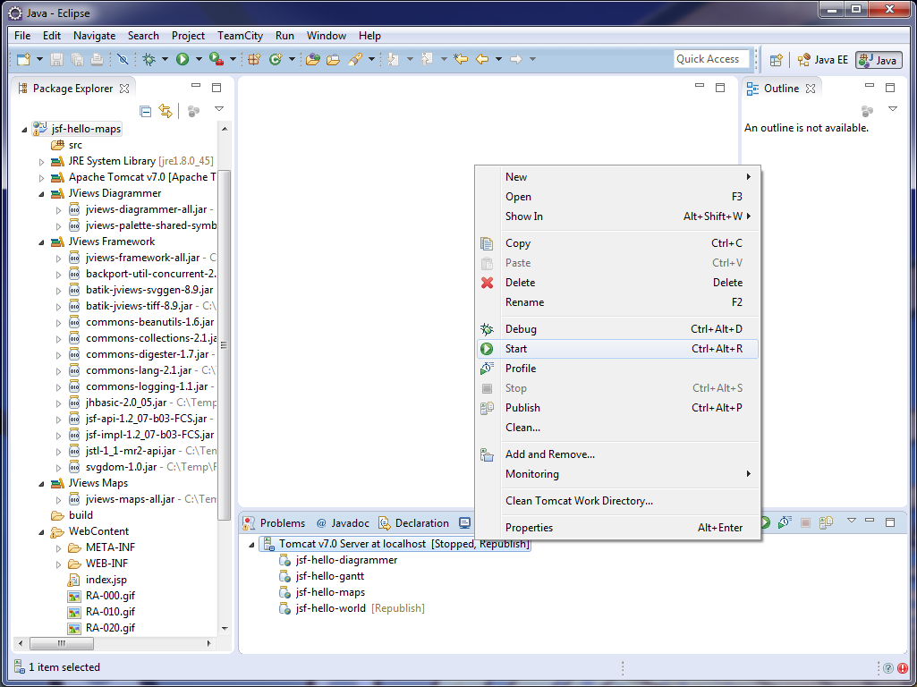The workspace is now configured and ready to receive JViews Maps JSF applications.