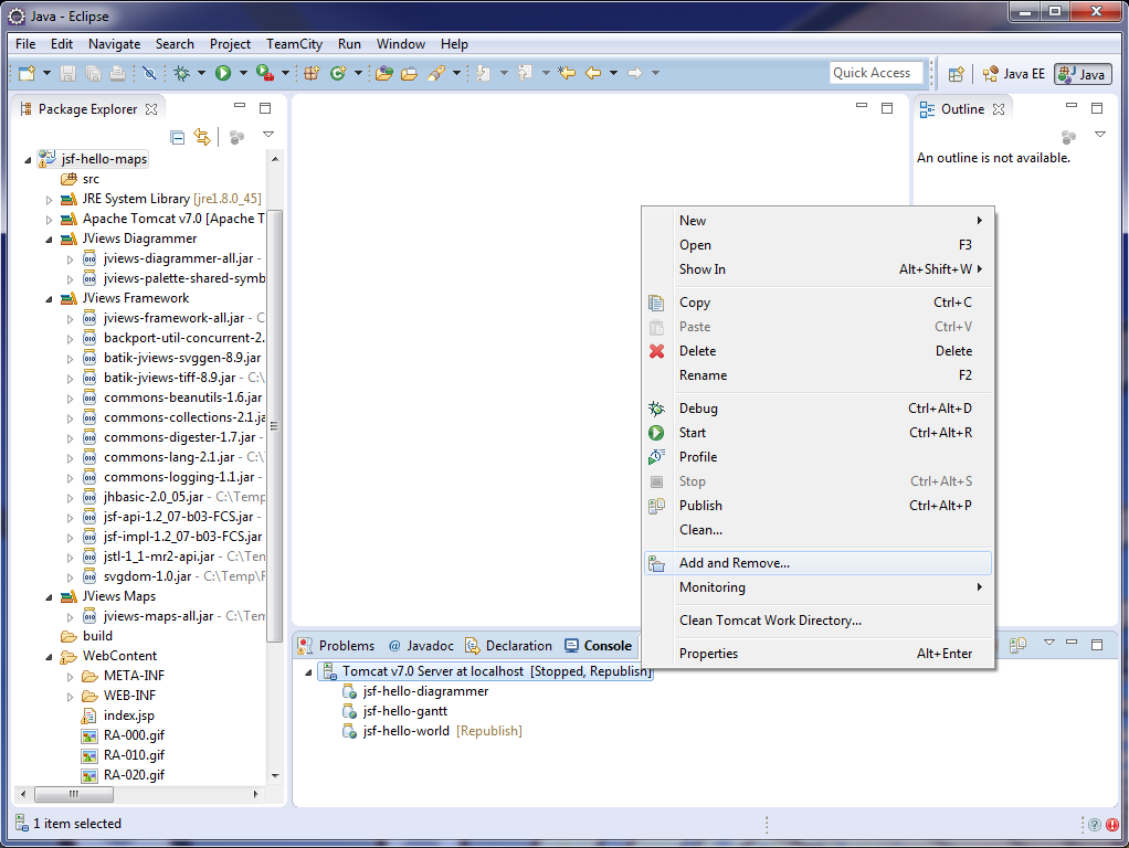 1. In the Server tab, right-click Tomcat v7.0 Server at localhost and select Add and Remove…: