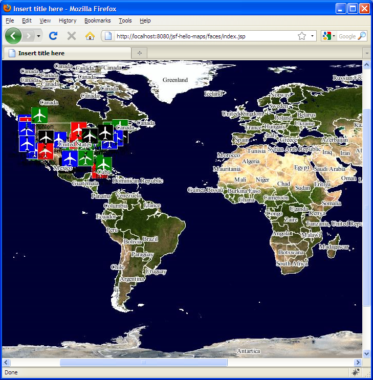Copy the files world.*, and RA-0*.gif from <installdir> \jviews-maps\codefragments\jsf-hello-maps\webpages to the WebContent folder of your project. The location of this example might change depending on the version of your JViews product.