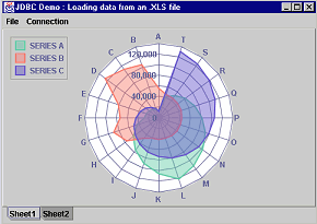 - A radar chart containing the data from the first sheet. This sheet contains three columns, each column being associated with one data set, and each data set being displayed by an area renderer with a predefined rendering style.