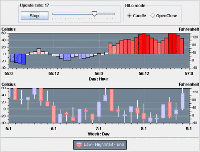 - The first one is used to display the actual temperature measurements. The temperature is rendered with bars whose color depends on the value of the temperature (blue for negative values, red for positive values). The temperature measurements are handled by a data set updated randomly at a given period. The sample assumes that a measurement is carried out every hour of the day.