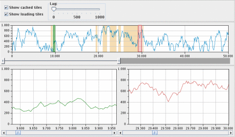 This sample demonstrates how to use the load-on-demand mechanism available in Rogue Wave JViews Charts. Two binary files hold the data displayed by this sample: