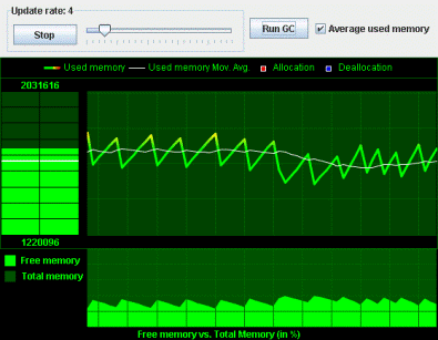 - The memory used (as a gradient polyline) compared to the moving average of the memory used (as a white polyline) over time.