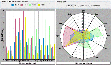 This sample displays two representations of the same data set. When a legend item is clicked, the graphical representations of the corresponding data set are changed to reflect the selected state of the data set: the bar chart renderer is filled with a hatched pattern, and the area chart renderer draws a white circle for each point of the data set.