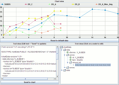 This sample displays the contents of an XML document (the DOM) in three different representations: as a text view, as a tree view, and as a chart.