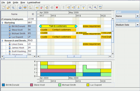 This sample presents a simple data viewer that demonstrates the use of basic JViews Gantt concepts, as well as user-defined activities. It shows the vacation of the personnel as an activity. It shows this data by an activity-oriented Gantt chart synchronized with a resource-oriented Gantt chart. The sample also demonstrates model filtering and user-defined z-ordering of activities.