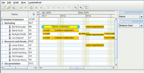 This sample shows a simple project scheduling application displayed as a resource-oriented Schedule Chart.