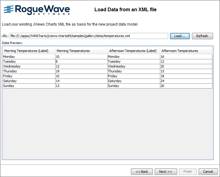 Data contained in the temperatures.xml file is displayed in the Data Preview area.