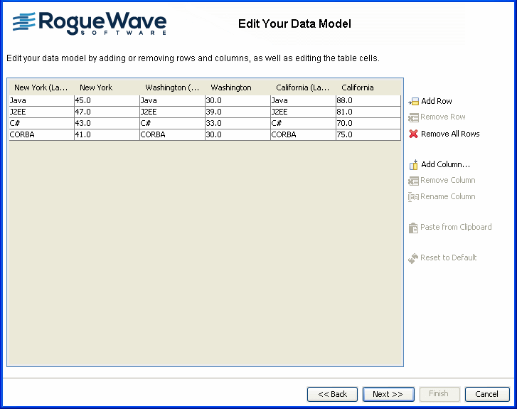 2. Edit the data model by adding or removing row and columns, clearing all the data or resetting the model to the default value.