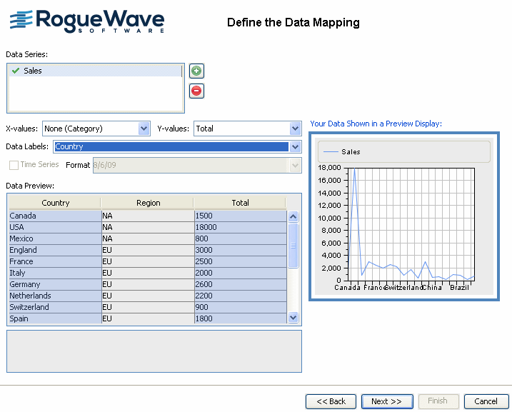 The data mapping is complete when all the columns containing the data that you want to view are mapped to data series. You are going to add a new series and call it Sales.