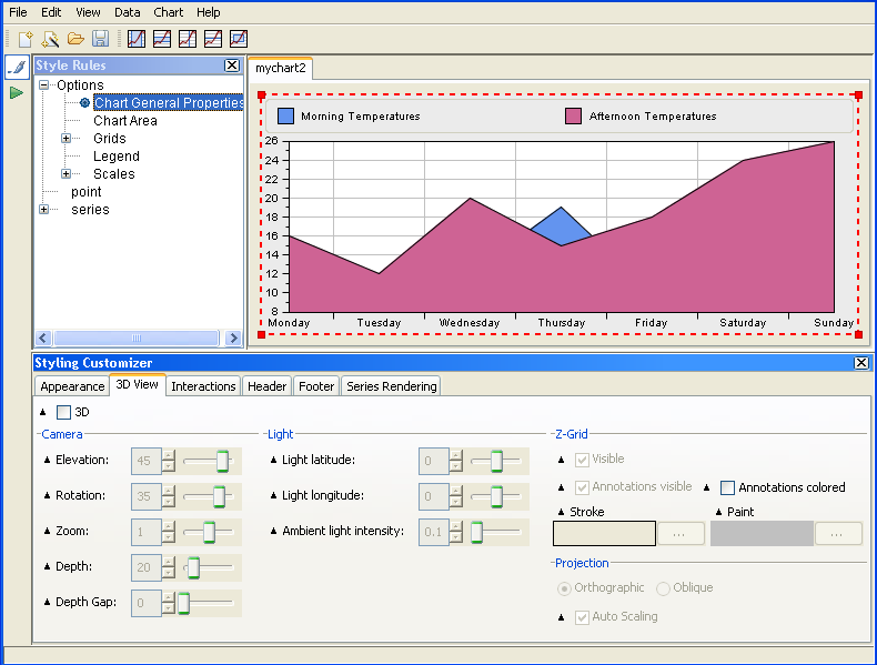 4. Select Chart General Properties from the Style Rule tree pane and make sure the 3-D View tab is active in the Styling Customizer.