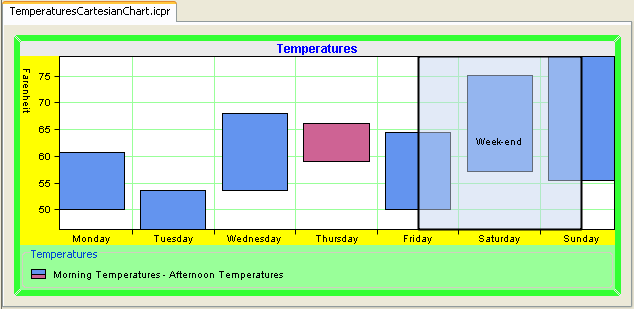You are going to decorate your chart by highlighting the week-end period using a range indicator which represents a data interval equal to the week-end period.