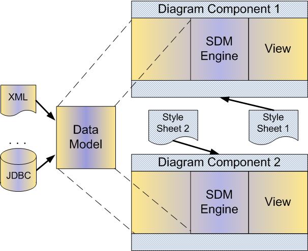 CSS syntax—a Web standard—but you need not bother with the details of this syntax at this point. The separation of style sheets and the data model from the diagram component means that you can build several components based on the same data, with the same or different styling, see the following figure.
