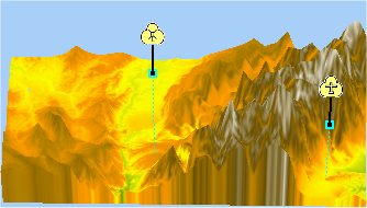 Although symbols are 2-dimensional objects, they can be used in 3D Views. When used in this way, symbols have a particular representation on the 3D View to make them clearer and more visible, otherwise they could be hidden behind a terrain elevation, see