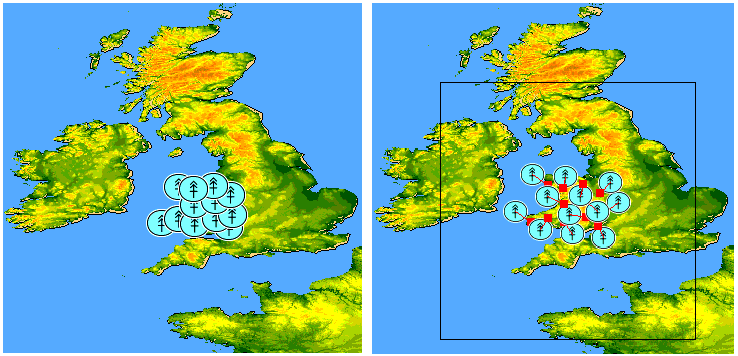This feature enables you to separate overlapping symbols that are positioned very close together and which give a cluttered appearance to the view. Separating symbols in this way is done by dragging a rectangle over the set of symbols of interest. This displaces all the symbols related to the current SDM model displayed (and contained within the rectangle) and removes the clutter from the view.