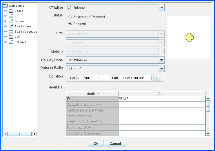 b. From the lists displayed select the values for Affiliation, Size, Mobility, Country code and Order of battle, or accept the defaults.