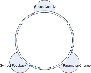 This mechanism works as a loop. A user interaction modifies the value of a parameter, this new value is processed by the symbol in order to give the appropriate visual feedback. Both actions in this loop are completely independent, that is, the interaction does not need to 'know' what the visual effect is.