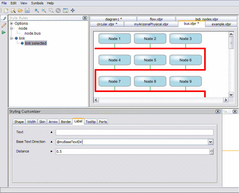 This section describes how to set a different value for the base text direction of a specific text element in an IlvDiagrammer object by using a parameter-based method. The example is based on a link style rule, but the principle is the same for any object contained in the diagram.