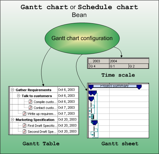 The following figure shows how the Gantt chart and Schedule chart beans can be described as a predefined combination of a configuration, a table, a Gantt sheet, and a timescale.