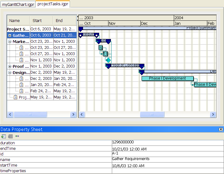 Selecting an object in the Gantt Sheet (activities or constraints in a Gantt chart; resources or reservations in a Schedule chart) displays the properties of this object in the Data Property Sheet. The following figure shows the activity Phase 1 Development selected in the Gantt Sheet (upper right pane) and the properties of this activity in the Data Property Sheet (lower pane).