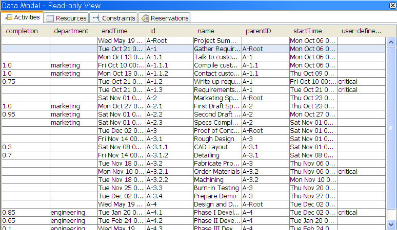 Use the tabs to view the different object types (Activities, Resources, Constraints, and Reservations) in the data model.