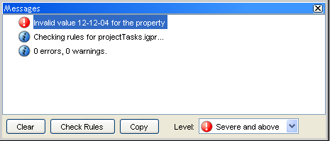 The Designer provides a Messages panel that you can show or hide. This panel is dockable in any position within the main panel or can be a separate window.