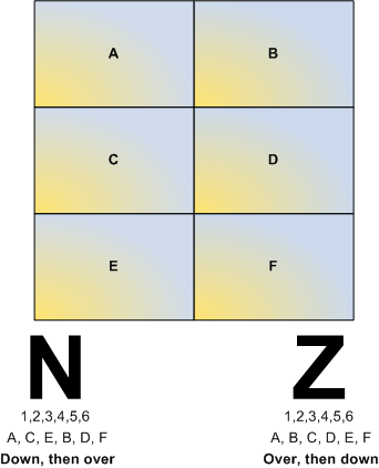 The following figure shows the graphical reference for the page-printing order of a six-page document. The sequence of pages is shown as running from A to F, which corresponds to page-numbering from 1 to 6 and the printing order Down, then over and Over, then down as shown in the following graphic.