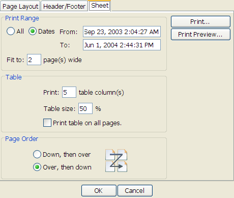The fields in the Sheet tab allow you to control the print range, the way the table is processed, and the order in which pages are printed.
