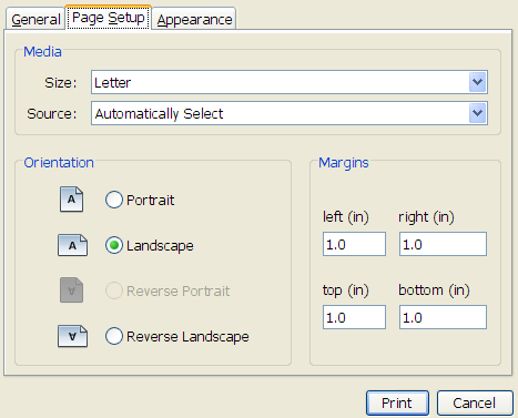 You can access Page Setup by choosing File > Page Setup or by selecting the Setup tab in Print Preview. The Page Setup window offers extensive setup facilities.