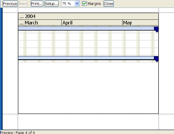 If you now set the Print Range to Fit to: 4 page(s) wide, you obtain more space for time in the sheet. The zoom is intelligent and extends the activity bars to be printed over the four pages. However, the physical zoom on the table does not cause the column or columns to be enlarged. On pages 2 to 4, no table is printed, but only the time scale and the extended activity bars in the Gantt sheet. The following figure shows the Print Preview of the final page of the four pages with this setting.