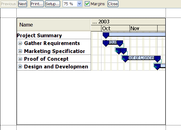 Now, adjust the table so that only one column is displayed in the Gantt chart in Editing Mode and you can see the words in full. Leave the print settings as they were in the previous example. Select Print Preview.