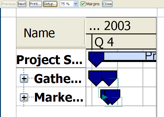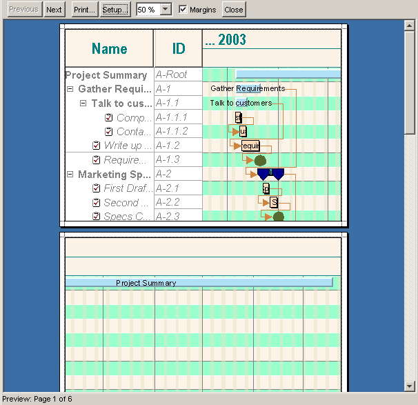 Print the Gantt chart developed in this Getting Started example with the Down, then over option set, with the chart printed on six pages. The following figure shows the page-printing order by way of the print preview of the first two pages. You can see that it prints all the way down the leftmost part of the Gantt chart, before working its way across the next horizontal span of the chart. You can see that it prints all the way down the leftmost part of the Gantt chart, before working its way across the next horizontal span of the chart.