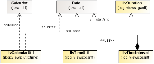 Throughout the JViews Gantt product, time is represented by the standard java.util.Date class, duration by IlvDuration, and time intervals by IlvTimeInterval.