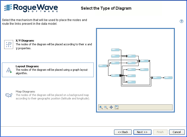 NOTE You can create a Map Diagram only if you have purchased and installed the Rogue Wave® JViews Maps product. Otherwise, a warning message appears.