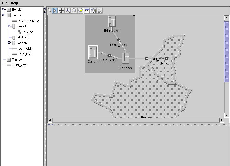 The BSC network elements, Cardiff and London, are both contained under Britain. The BTSs are child objects of the BSCs.