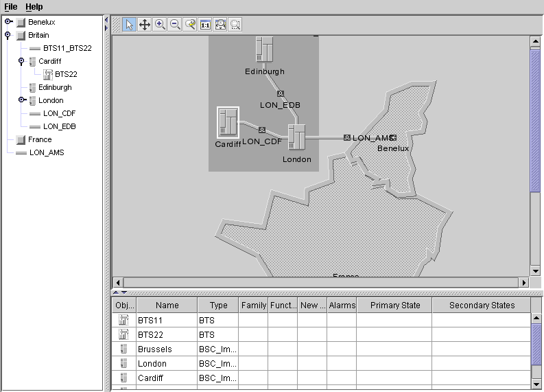 In this example, the objects to be displayed are restricted by class to the network elements. Therefore, neither the regions added in Step 1 (