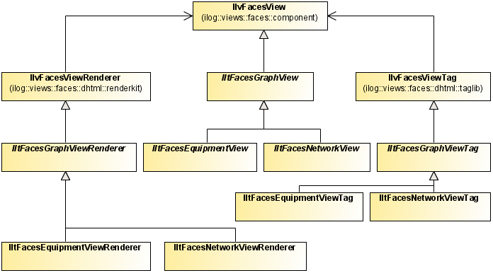 The Graph component is based on the view JSF component declared in the JViews Framework JSF library. It inherits all the features and characteristics of the view JSF component. In addition, it extends its functionality to display the specific JViews TGO business objects by using an underlying IlpGraphView instead of a generic IlvManagerView. The following class diagram shows these dependencies:
