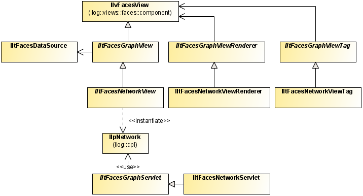 The tag implementation handles the various tag attributes declared in the tag library descriptor file for the networkView component. The component implementation handles all this information so that the renderer can create a JavaScript representation of it while the image servlet processes the client requests, directly interacting with the underlying IlpNetwork component and modules through its API. The following class diagram shows these dependencies: