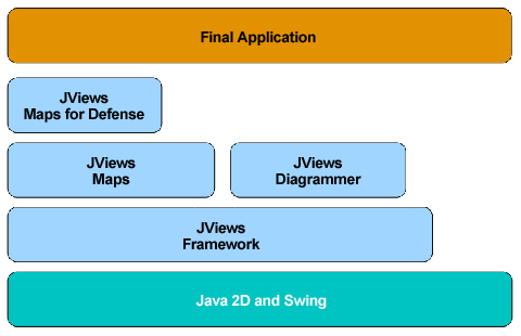 Starting with the bottom layer, all Rogue Wave JViews libraries are built on top of the Java2D and Swing libraries, with no platform-specific code. This means that applications developed with Rogue Wave JViews run on any platform that supports Java.