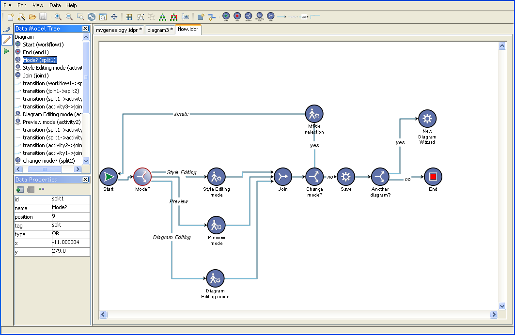 For example, in the flow diagram, click the good link icon in the toolbar, then click the Mode? node and then click the new manual activity node.