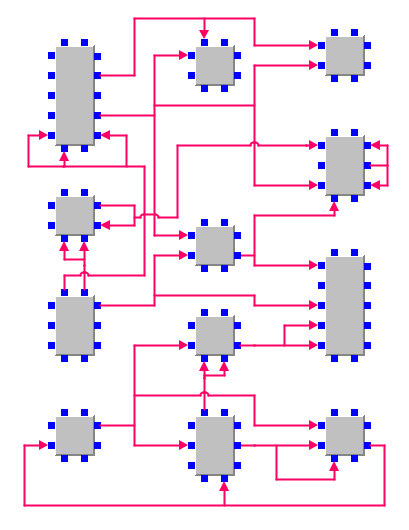 The following diagram shows an example of a hypergraph with many hyperedges used in an electrical signal diagram. The hyperedges are shown in red.