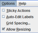 Describes the contents of the Options menu of the Rogue Wave JViews BPMN Modeler GUI.