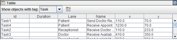 The Table View displays the elements of the diagram and their properties in a table. The Table View provides a filter that allows you to display only those elements that match a certain type.