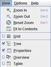 Describes the contents of the View menu of the Rogue Wave JViews BPMN Modeler GUI.